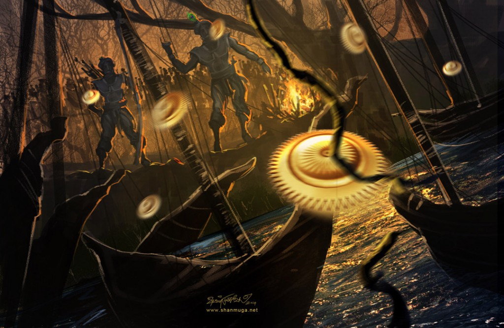 படைவீரர்கள் சிலர் அவர்கள் வந்த படகுகளில் கொடிக்கம்பங்களில் பந்தங்களைக் கட்டி அவற்றில் மீனெண்ணையை ஊற்றத்தொடங்கினர். கிருஷ்ணன் வானை நோக்கியபின் “பந்தங்கள்” என்றதும் வீரர்கள் படகுகளில் கட்டப்பட்ட பந்தங்களைக் கொளுத்தத் தொடங்கினர். படகுகளின் பந்தங்கள் அனைத்தும் எரியத் தொடங்கியதும் தழல்வெளி நீர்ப்பிம்பங்களுடன் சேர்ந்து காட்டுத்தீபோல நெளிந்தது.