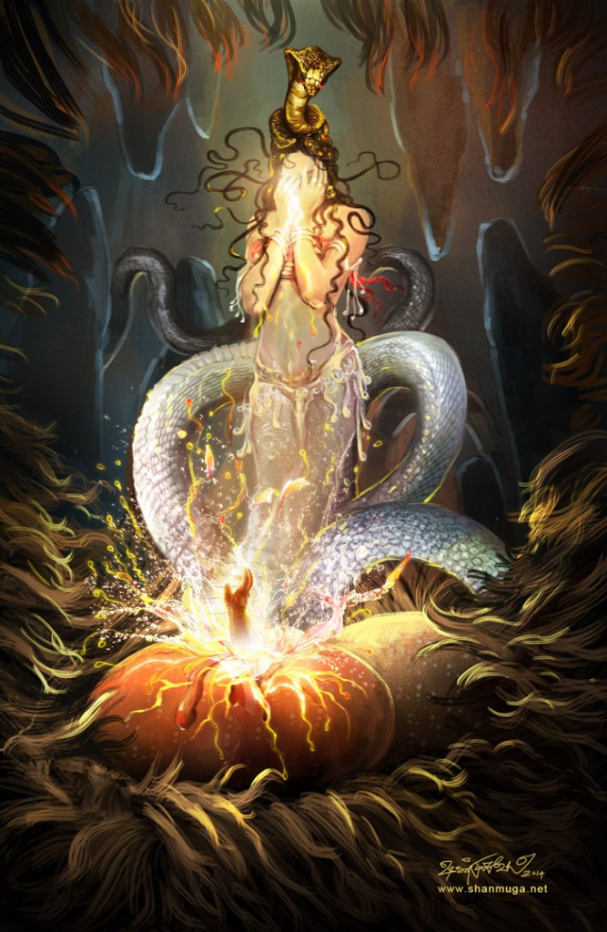 கத்ரு ஆயிரம் மடங்காகப் பெருத்து வானை நிறைத்தாள். ஆயிரம் கரிய முட்டைகளை இட்டாள். அவை ஆயிரம் வருடம் அவளால் அடைகாக்கப்பட்டன. அவை வெடித்து ஆயிரம் கன்னங்கரிய நாகங்கள் வெளிவந்தன. எரித்துளி போல ஒளிவிடும் விழிகள் கொண்டவை. அவை மேற்கே தலை வைத்து கிழக்கே வால் வைத்து வானத்தை நிறைக்குமளவுக்கு பெரியவையாக இருந்தன. அவற்றின் இருளால் வானம் நிறைந்தது. ஆகவே பிரம்மதேவர் அவற்றை பாதாள உலகுக்குச் சென்று வாழும்படி ஆணையிட்டார். அவை நெளிந்தோடி பாதாளத்தின் இருளை நிறைத்தன.