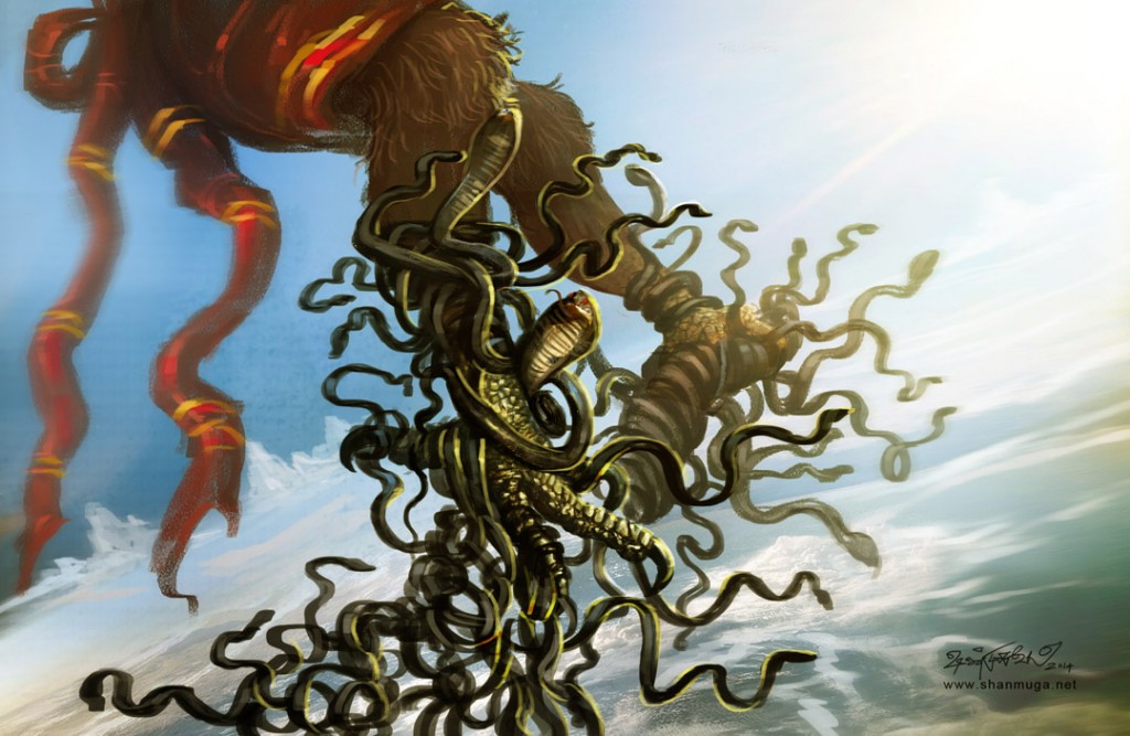ஒருநாள் கத்ருவின் நாகமைந்தர்கள் தங்கள் அன்னையிடம் வந்து பணிந்து “நாங்கள் சூரியனை வெல்லவேண்டுமென விழைகிறோம் அன்னையே” என்றனர். “எங்கள் பாதாள உலகில் இருளே நிறைந்துள்ளது… சூரியனை கட்டி இழுத்துக்கொண்டுசென்று அங்கே சிறைவைக்க விரும்புகிறோம்.” கத்ரு “விண்ணளக்கும் சூரியனை நோக்கிச் செல்வது உங்களால் இயலாதே” என்றாள். “உன் இளையவள் மைந்தன் சிறகுடையவன். அவனிடம் எங்களை அங்கே கொண்டு செல்லச்சொல். நாங்கள் கதிரவனை சுற்றி இழுத்து பாதாளத்திற்கு கொண்டுசெல்வோம்” என்றனர்.